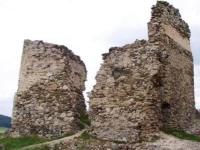 | Zřícenina hradu stoji na vrcholu osamocené výšiny (403 m.n.m). Vrchol kopce ovlivnil oválnou dispozici jádra hradu, obepjatého okružním příkopem, a předhradí, zužujícího se ve směru hřbetu, po němž stoupala příjezdní cesta. Vedla kolem ledvinového bolverku mezi dvěma šíjovými příkopy, který měl charakter předsunuté šíjové bašty ze dřeva a hlíny. S předhradím byl zřejmě spojen můstkem, který překonával 4,5m hluboký a 18m široký příkop. Plocha vrcholku a poměrně mírné svahy umožnily, aby bylo oválné hradní jádro ovinuto dvojím pásem příkopů a valů. Bolverk byl vlastně zvýšenou a rozšířenou čelní částí vnějšího okruhu, který celý mohl být výsledkem opevňování v 15. století. | | Vnitřní pás valu se pak napojoval na čtyřboké předhradí (37x30m), které mělo na východním boku zděný vstupní koridor. Cesta do předhradí se za koridorem musela ostře stočit, a kdo chtěl pokračovat do vlastního hradu, šel přímo po rozšířeném a obezděném valu až k přemostění příkopu. Most byl jistě dřevěný, ale opíral se o zděný pilíř na dně příkopu. Bezvěžové jádro hradu vymezovala vysoká a 2m silná zalamovaná hradba, k níž byl přistavěn trojprostorový palác s trámovými stropy. Šlo tedy o typický hrad s plášťovou zdí. Později byl palác směrem k jihu prodloužen o klenutou část a zvýšen o druhé patro. Datování další budovy, po níž zůstaly stopy pří západní hradbě, nelze určit bez archeologického výzkumu.atrně po zkušenostech z obléhání někdy v 15 století zesílili ohrožené jižní čelo třemi masivnímy pilíři. Protože byly vysoké jako hradba, kterou podpíraly, mohly být využity k obraně jako jakési věžice. |  | | Po třech čtvrtinách obvodu jádra asi od počátku obíhal parkán. Procházela jím totiž komunikace k bráně v severní špici hradu. Vedení cesty bylo důmyslné, neboť příchozí byl dlouho pod dohledem stráží na hradebním ochozu, a v případě nutnosti bylo v úzké uličce opravdu snadné ho zneškodnit. |  |  |  |  |